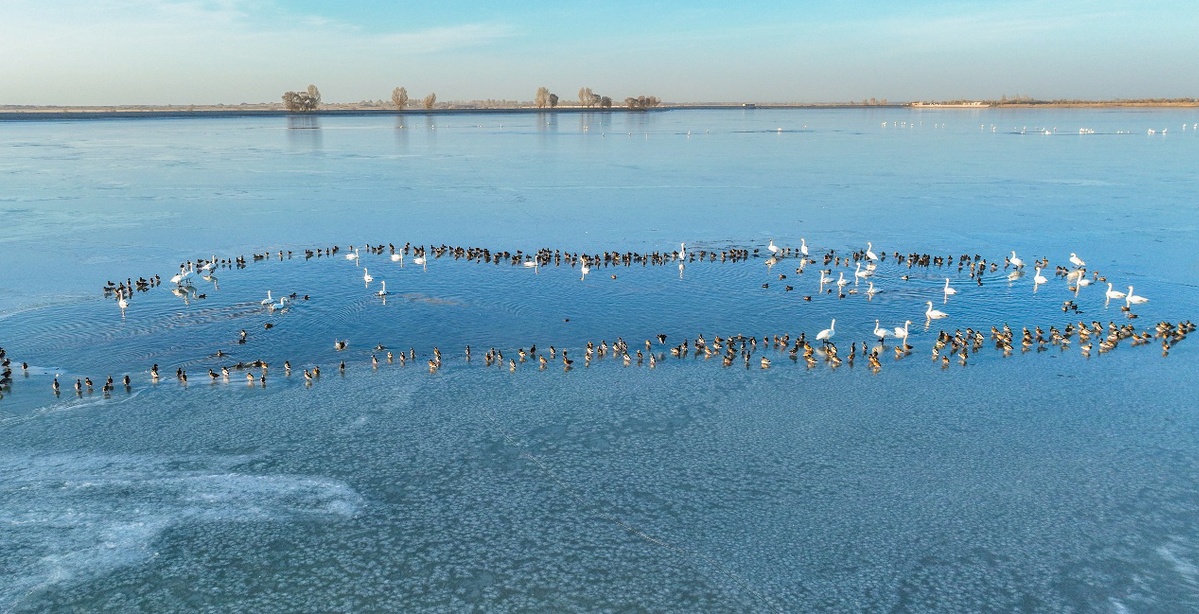 近日,在甘肃省酒泉市金塔县集集水库湿地,成群候鸟的白天鹅、红乳鸭聚集在湖中,成为初冬湿地一道靓丽的风景。