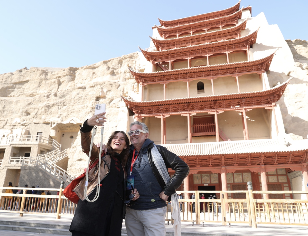 10月12日,嘉宾在莫高窟自拍。中国日报记者 陈则步 图